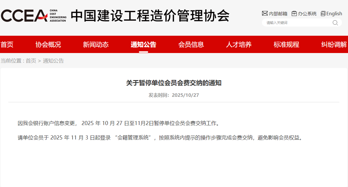 【转发】中国建设工程造价管理协会关于暂停单位会员会费交纳的通知
