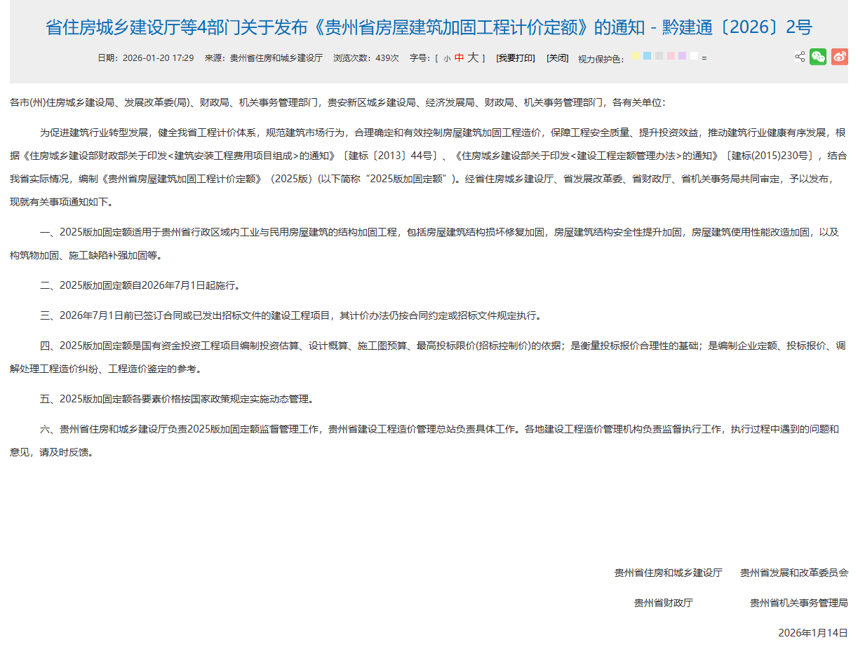 【转发】省住房城乡建设厅等4部门关于发布《贵州省房屋建筑加固工程计价定额》的通知 - 黔建通〔2026〕2号